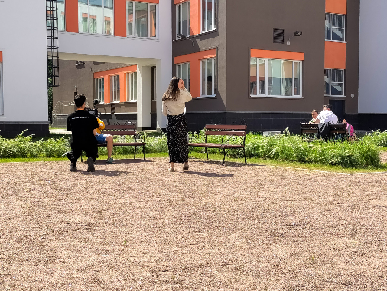 На фото оператор на одном колене снимает человека, сидящего на скамейке, что является частью съёмочного процесса. Рядом находится женщина, участвующая в организации сцены. По краям двора сидят люди, наблюдающие за происходящим. Школьные здания выполнены в бело-серой гамме с оранжевыми вставками вокруг окон. На переднем плане — гравийная площадка, окружаемая газоном и растительностью. Фотография подойдёт для материалов о съёмках в образовательных учреждениях и организации работы выездной команды.