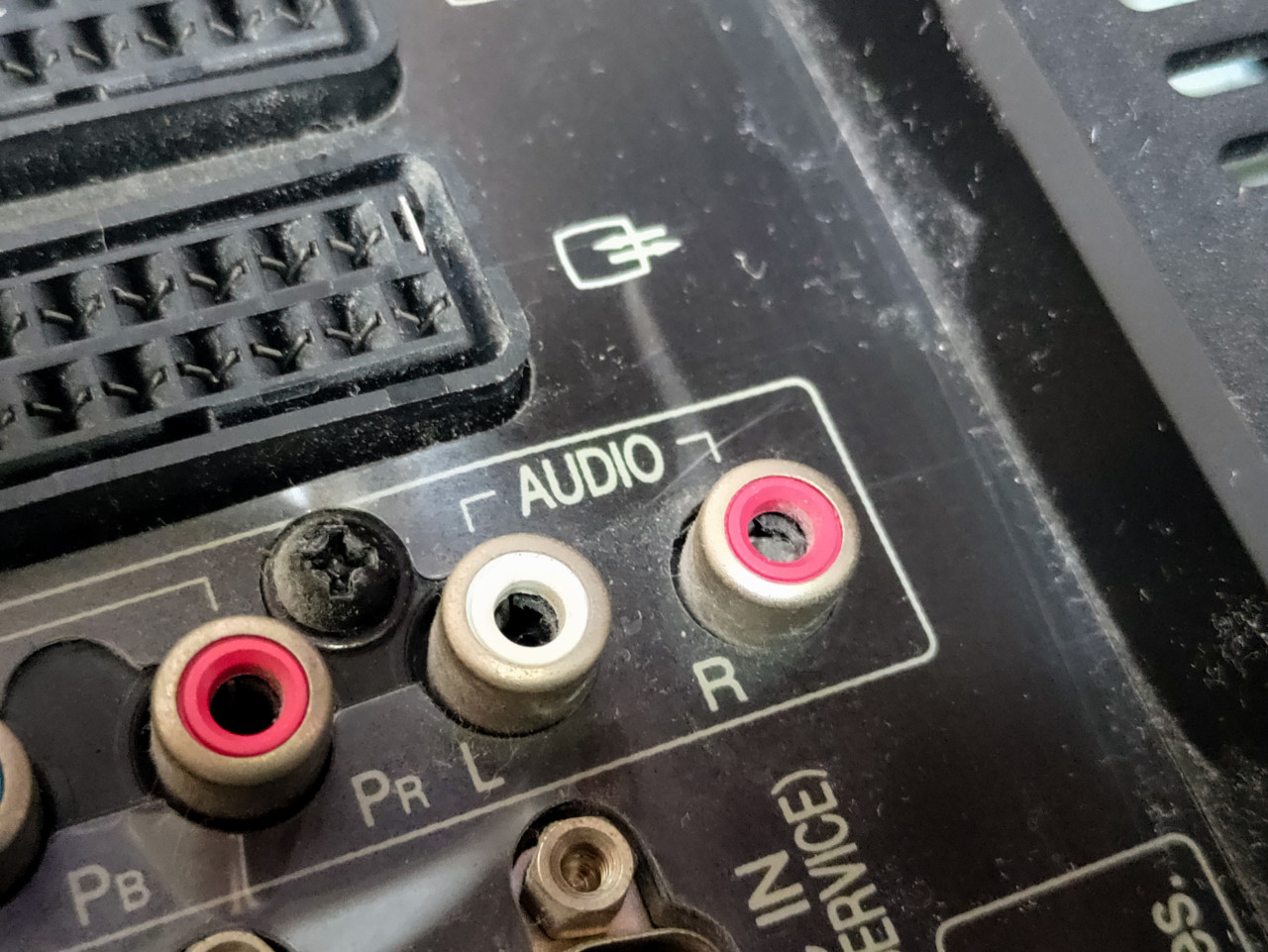 На снимке представлен участок задней панели телевизора с аудиовходами в формате RCA, отмеченными белым и красным цветом. Вокруг разъёмов видны дополнительные элементы корпуса, включая винт крепления, часть многоконтактного разъёма и поверхность панели, покрытую пылью. Маркировка «AUDIO» подчёркивает назначение разъёмов. Изображение можно использовать в материалах по подключению аудиоустройств, технических инструкциях, статьях о ремонте или обзорах бытовой электроники.