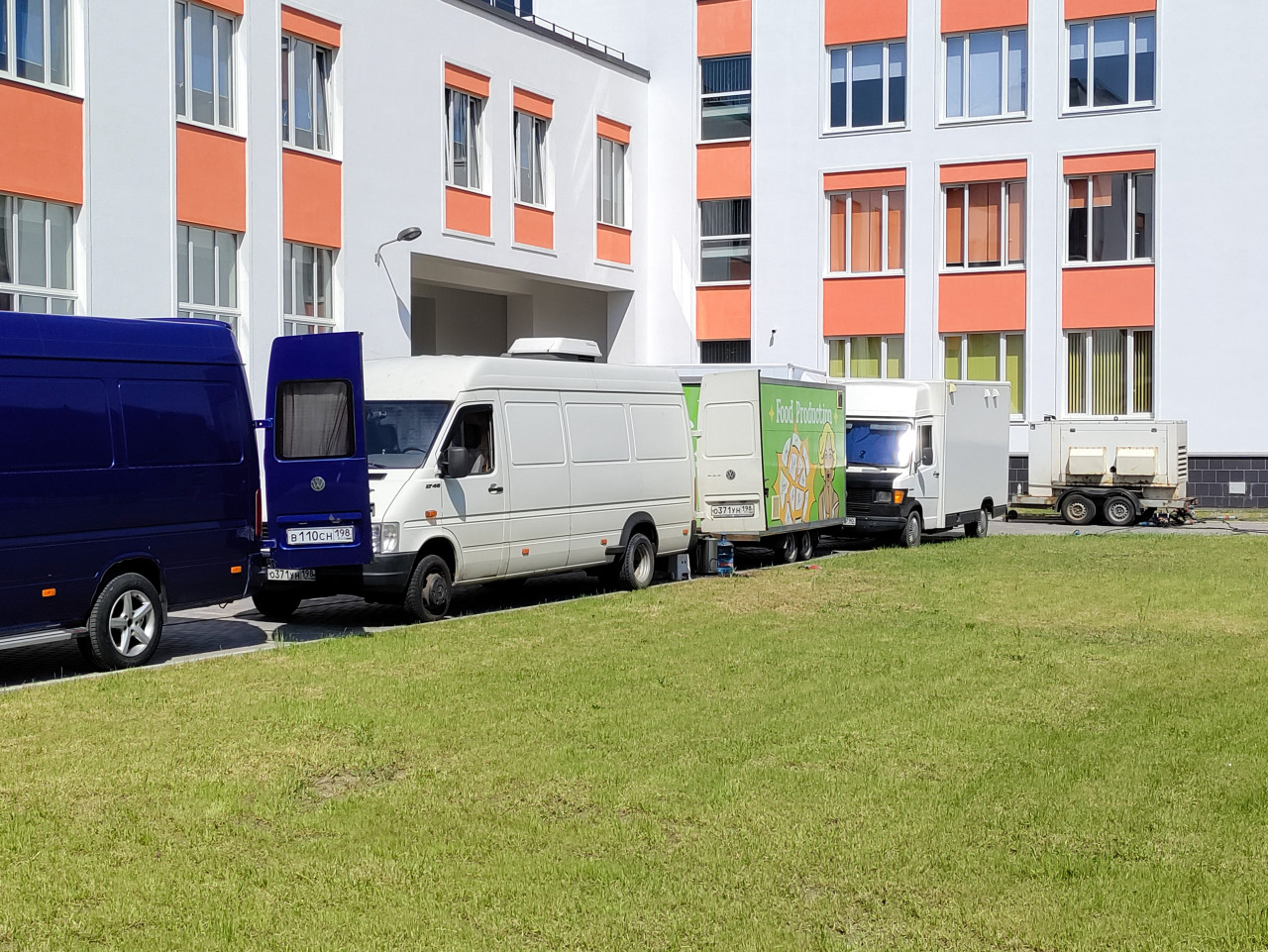 Ряд технических фургонов и трейлеров съемочной группы у здания школы