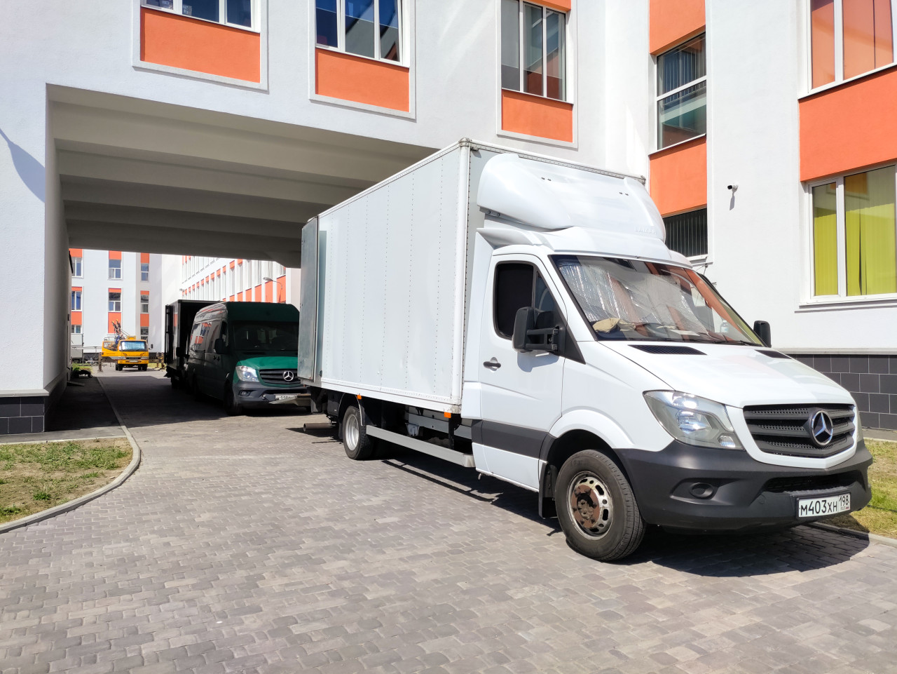 На изображении видны два фургона съёмочной группы, припаркованные под аркой современного жилого комплекса. На переднем плане расположен белый грузовой фургон, а позади него — тёмно-зелёный сервисный автомобиль. Такая техника обычно используется для перевозки оборудования, реквизита и рабочих материалов. На заднем плане заметны элементы строительной техники и городского пространства. Сцена демонстрирует размещение транспорта съёмочной группы в ограниченном дворовом пространстве. Фотография пригодна для материалов о работе выездных съёмок и технической логистике.