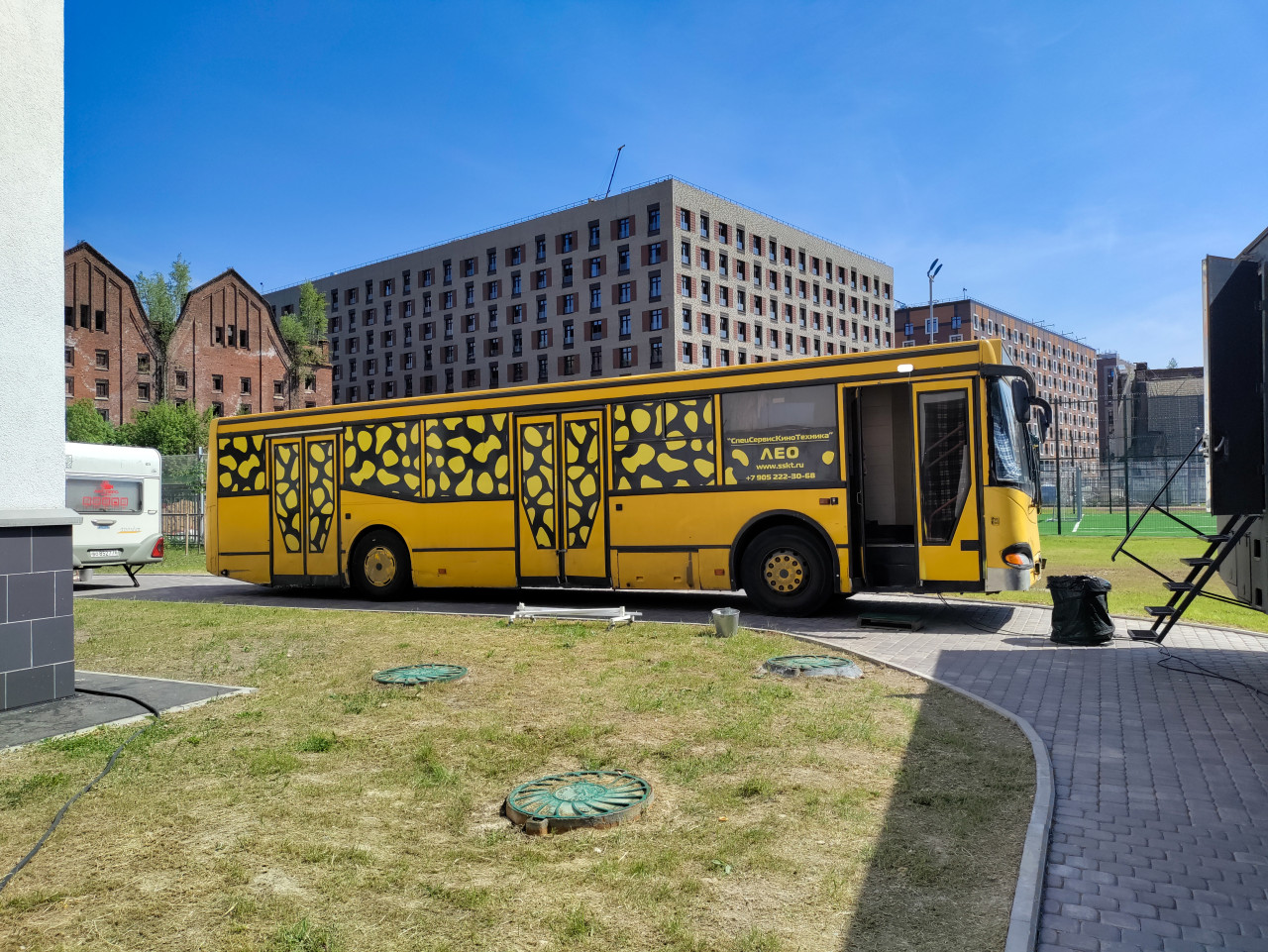 Длинный сервисный автобус съёмочной группы в жилом квартале