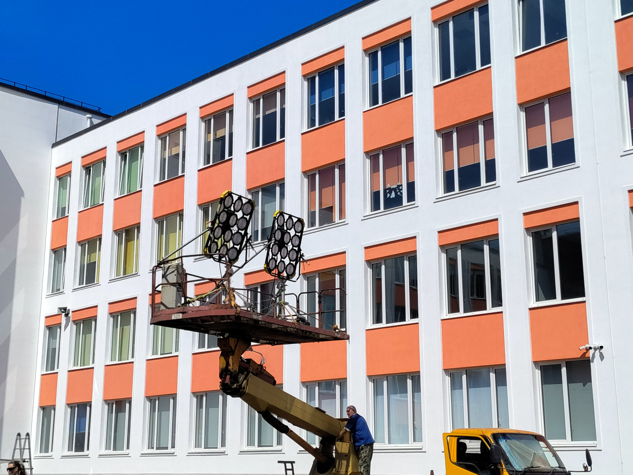 На фото показана подъёмная платформа с установленными блоками мощных осветительных приборов, размещённая на стрелe жёлтого грузовика. Установка поднята на высоту на территории школы, что видно по типичной архитектуре фасада: белые стены, большое количество одинаковых окон и оранжевые вставки вокруг них. Работник регулирует оборудование у основания подъёмного механизма. Осветительная система состоит из нескольких секций круглых светильников, применяемых для съёмок на улице. Кадр подходит для материалов о подготовке съёмочной площади, работе технической команды и использовании профессионального света при съёмках.