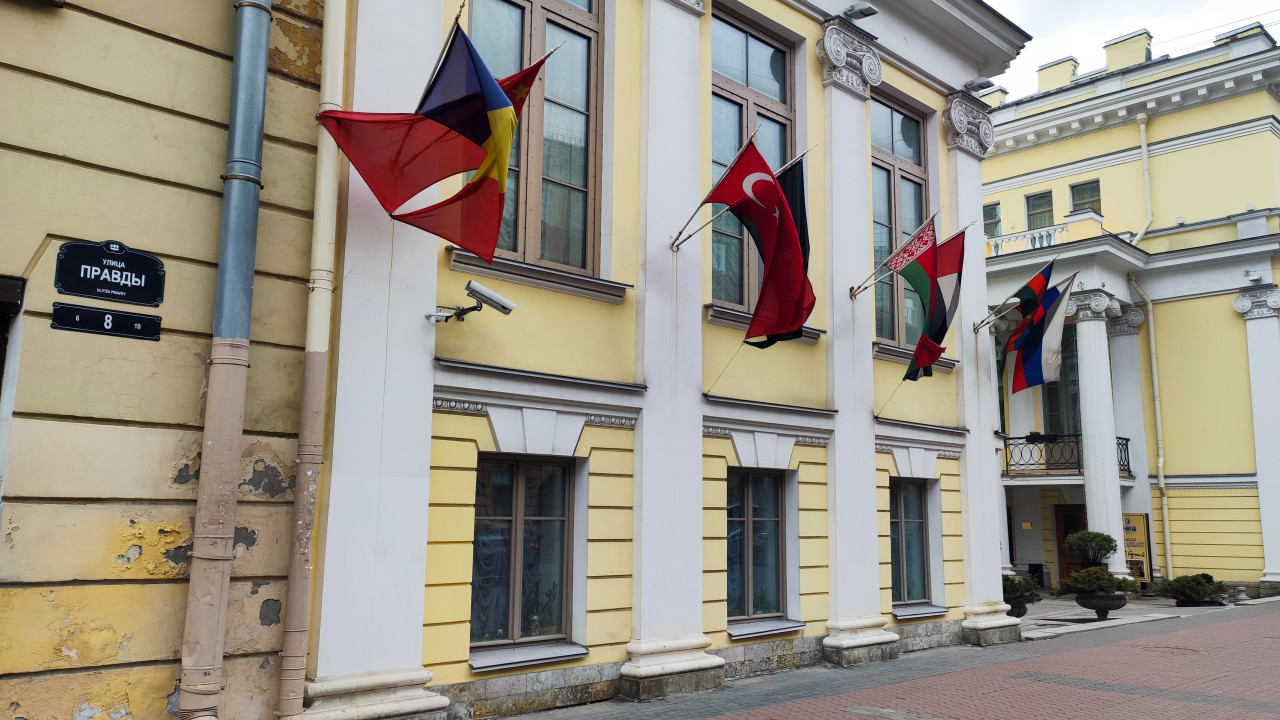 Фасад исторического здания гостиницы Эрмитаж с государственными флагами