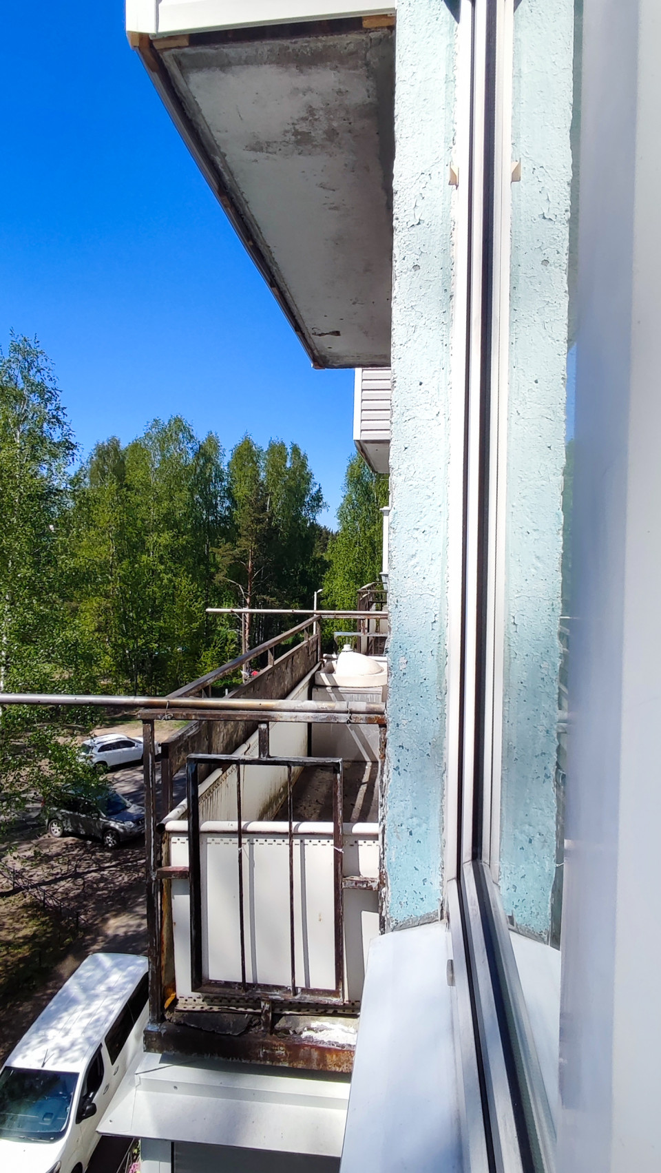 На фотографии показан открытый балкон многоэтажного жилого дома, снятый с уровня окна. Видна металлическая ограда с признаками коррозии, бетонная плита балкона и элементы фасада здания. Внизу заметна припаркованная машина и часть двора. На заднем плане — густые зеленые деревья, указывающие на летний период съёмки. Кадр отражает состояние наружных конструкций и общий вид жилой застройки. Фотография подходит для материалов о техническом состоянии зданий, дворовой инфраструктуре, городском жилье и благоустройстве.