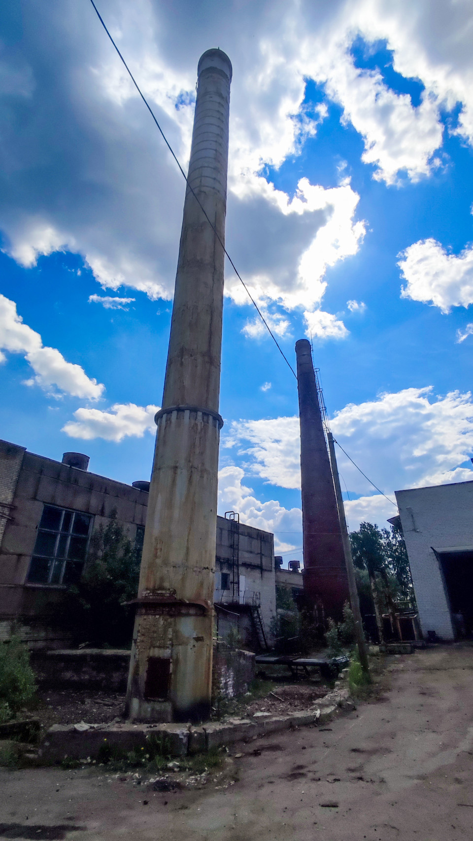 На фотографии показаны две дымовые трубы: ближняя металлическая с сильно выраженной коррозией и следами эксплуатации и расположенная позади кирпичная труба с металлической лестницей. Обе конструкции размещены среди промышленных зданий из кирпича и бетона, некоторые элементы которых выглядят заброшенными. В нижней части кадра видна площадка с остатками строительных материалов и фрагментами бетона. Съёмка выполнена днём при переменной облачности, что создаёт контраст между индустриальными объектами и небом. Этот кадр можно использовать в материалах о состоянии промышленной инфраструктуры и городских промышленных зонах.