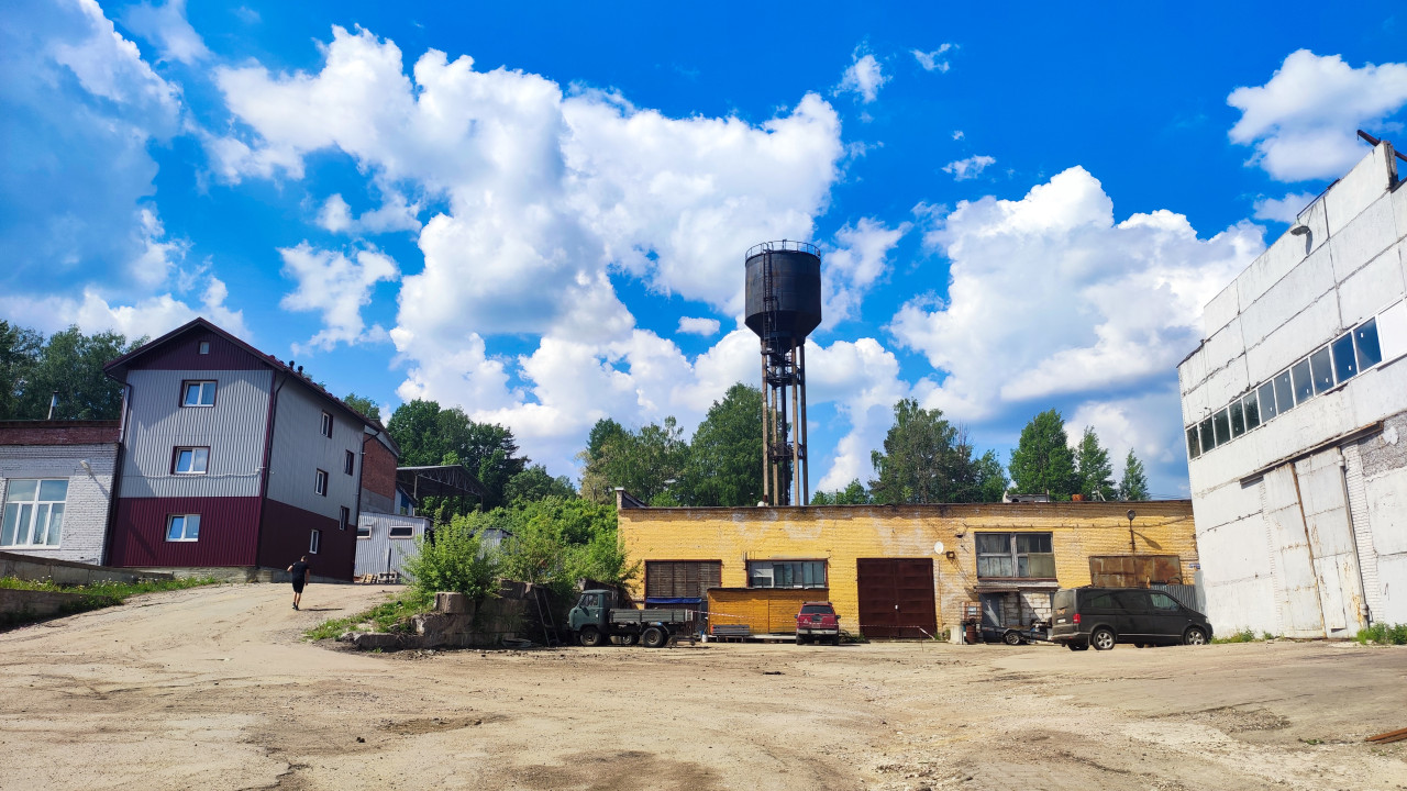 На фотографии представлена промышленная площадка с несколькими зданиями различного назначения. Центральным элементом является металлическая водонапорная башня с цилиндрическим резервуаром, установленная на высоких опорах. Перед ней — жёлтое кирпичное производственное здание с гаражными воротами и окнами, дополненное припаркованными автомобилями и хозяйственным оборудованием. Справа в кадре заметна белая промышленная постройка с панорамными окнами, слева — жилое или административное строение. Вся территория имеет грунтовое покрытие со следами техники. Съёмка выполнена днём при ясной погоде. Изображение подходит для материалов о работе промзон, инженерной инфраструктуре и городской периферии.