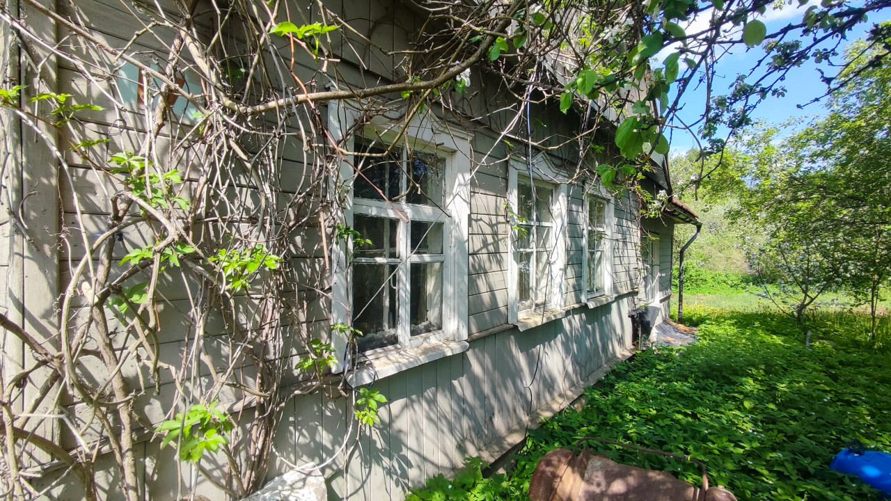 На фото изображен фасад деревянного жилого дома, частично скрытый густыми побегами вьющихся растений. На стене видны несколько старых деревянных окон с облупившейся краской и следами износа. Окружение дома заросло травой и листвой, что создает впечатление длительного отсутствия ухода. Фон представлен деревьями и густой зеленью участка. Снимок может быть использован в материалах о старом жилом фонде, дачных постройках и примерах запущенного состояния зданий из дерева.