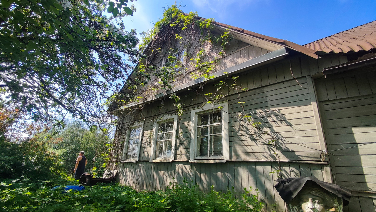 дом деревянный дом фасад окна растения зелень лианы участок дача деревня природа лето растительность частный дом плющ вьющиеся побеги крыша шифер человек частный сектор старое жилье ветки тень архитектура наружная отделка сад листья село дачный домПохожие фотографии