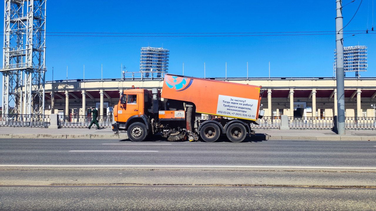 На фотографии изображена подметально-уборочная машина оранжевого цвета, стоящая на проезжей части на фоне стадиона «Петровский» в Санкт-Петербурге. Узнаваемый комплекс, построенный в 1920-е годы и реконструированный в 1970-х, является значимым спортивным объектом города. На кузове машины размещено объявление о наборе водителей и механизаторов. В кадре также заметны мачты освещения, ограждение набережной и прохожий в рабочей форме. Снимок можно использовать в материалах о городской уборке, транспорте, работе коммунальных служб и инфраструктуре Санкт-Петербурга.
