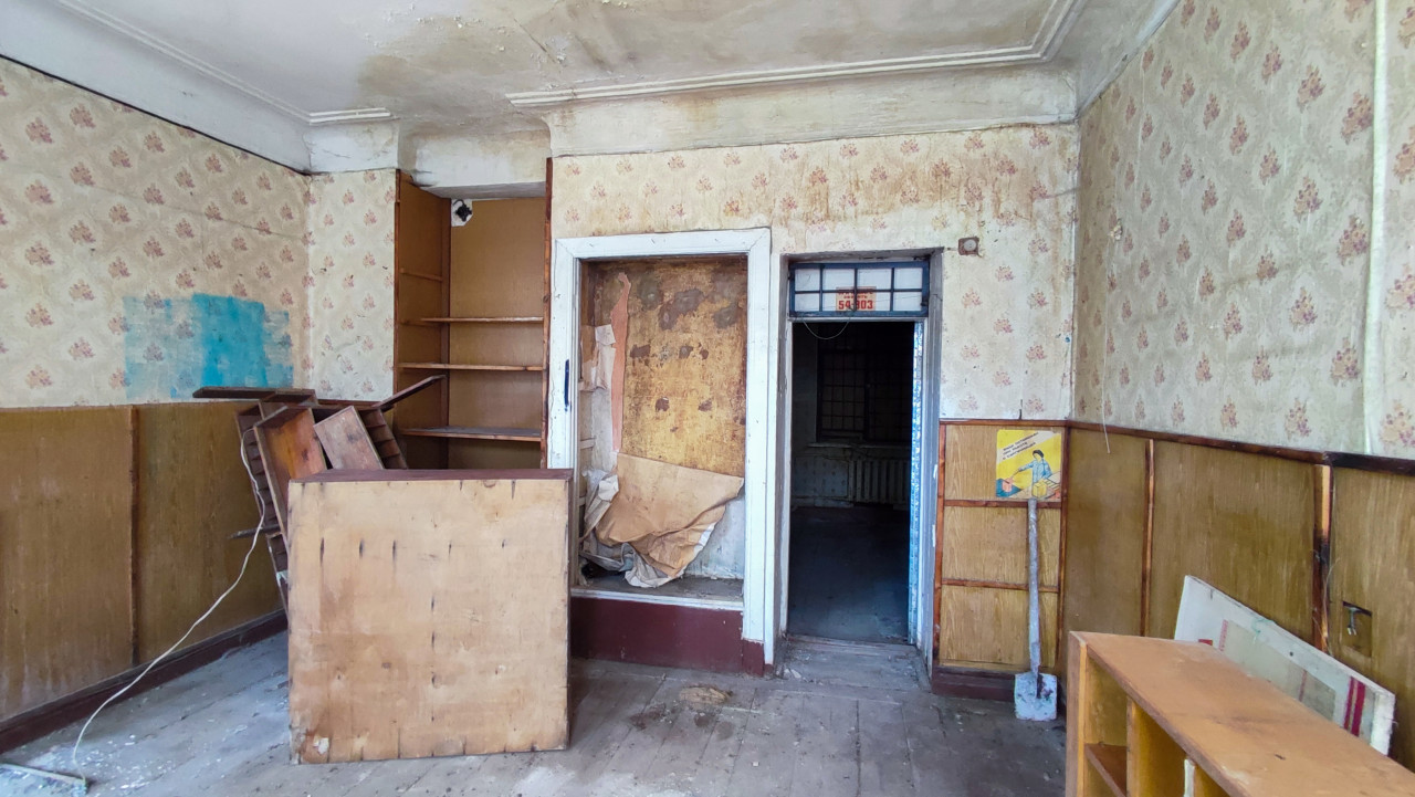 старое здание интерьер помещение износ разрушение облупившаяся штукатурка аварийное состояние техническое состояние заброшенное помещение обои деревянные панели мебель демонтаж стеллаж стены повреждения ремонт обследование дверной проём полки проводка пол отделка жилой фонд помещение перед ремонтом архитектура восстановление интерьеры внутреннее пространство анализ состоянияПохожие фотографии