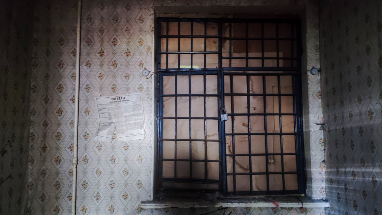 На фотографии представлен крупный план окна с металлической решеткой, закрепленной навесным замком. С внешней стороны проём закрыт плотным материалом. Стены помещения оклеены обоями с повторяющимся рисунком и имеют следы износа. Слева от окна висит лист с информацией о сигналах гражданской обороны. Подоконник повреждён, местами заметны следы влаги. Снимок можно использовать в материалах о техническом состоянии зданий, документации старых помещений, безопасности объектов и анализе состояния конструктивных элементов перед ремонтом.