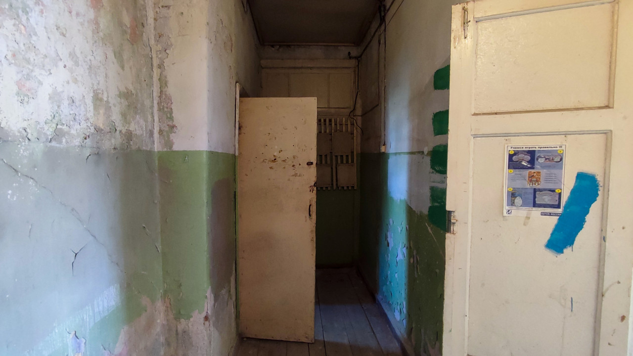 На фото показан коридор с частично осыпавшимися стенами, окрашенными в два цвета: нижняя часть — зелёная, верхняя — светлая. В глубине расположен дверной проём с открытой металлической дверью. На правой стороне видна дверь с памяткой, закреплённой сотрудниками почтовой службы. На полу лежат деревянные доски, а проводка проложена открытым способом по стенам. Снимок подходит для материалов о состоянии старых учреждений, ремонте, обследовании зданий или исследовании заброшенных помещений.