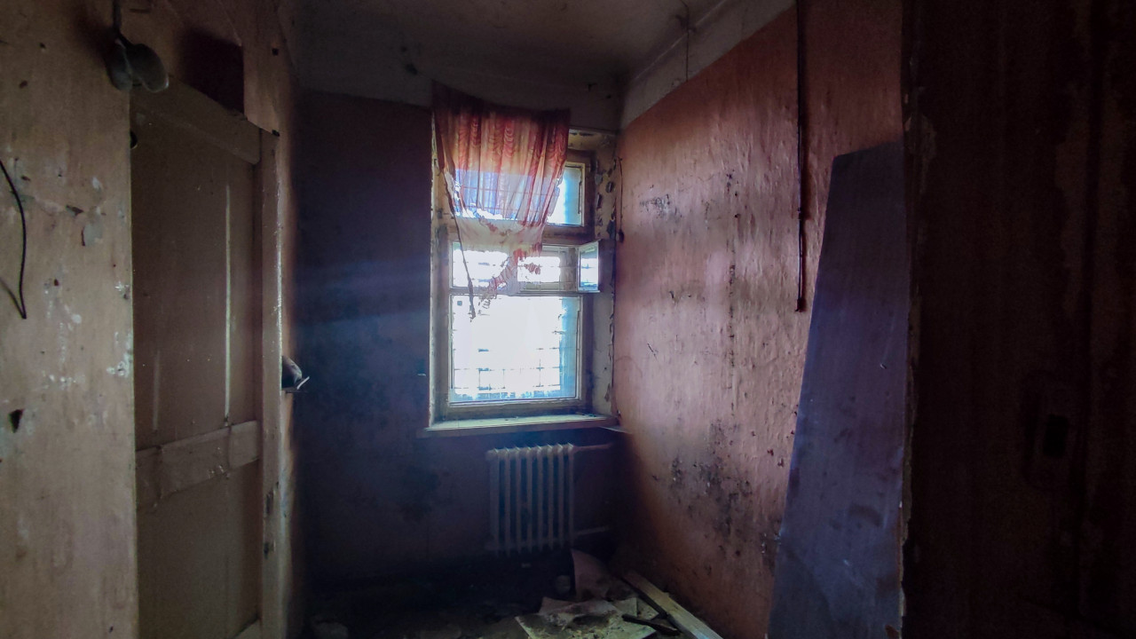 Комната с выбитыми стенами и окном с разрушенной шторой