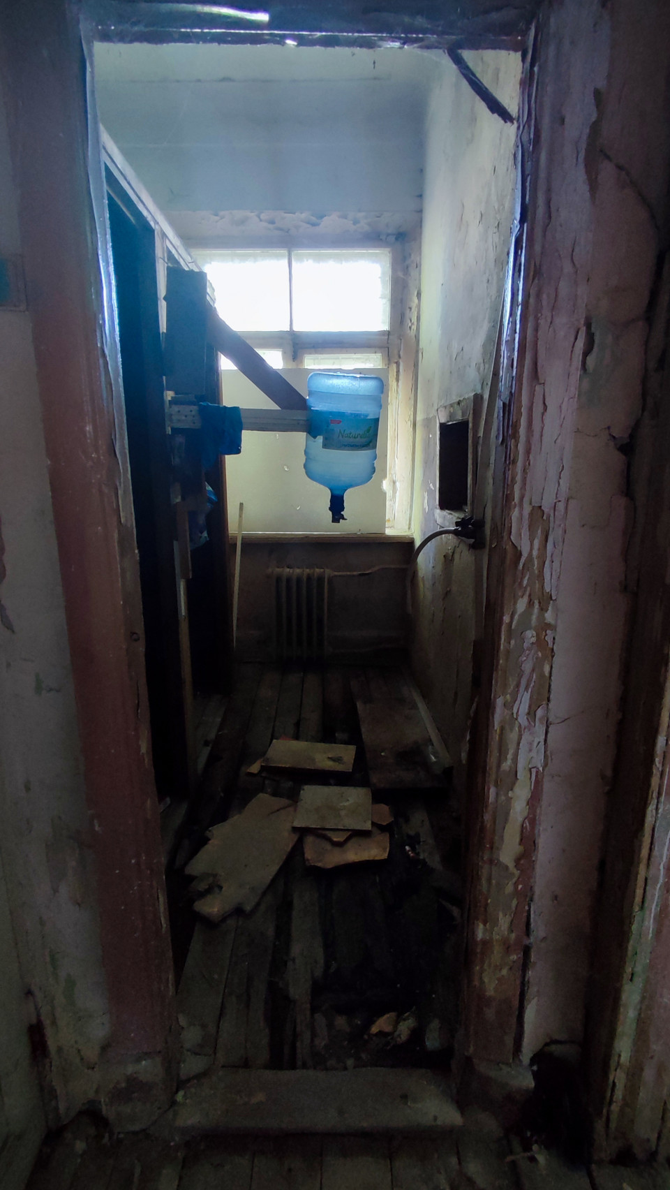 Узкое помещение с подвесной ёмкостью для воды и разрушенным полом