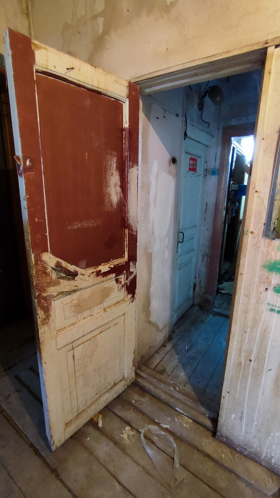 На фото показан дверной проём старого здания с установленной деревянной дверью, покрытой слоями старой краски. Дверь частично открыта, имеет следы повреждений и следы неоднократного перекрашивания. В глубине видна узкая секция коридора с дверью, проводкой и дополнительными элементами старого интерьера. На полу лежат деревянные доски, мусор и следы демонтажа. Снимок может быть использован для материалов о ремонте, аварийных зданиях, обследовании исторических построек и визуализации изношенных коридорных зон.