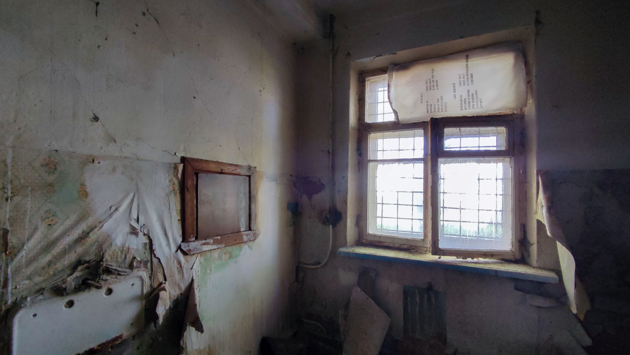 На фото изображена часть помещения с двумя окнами, оборудованными металлическими решетками. Над окном закреплен свёрнутый лист бумаги. Стены покрыты многочисленными трещинами, следами влаги и отслоившейся штукатуркой, частично сохранились участки старых обоев. В центре кадра — деревянная рамка, вероятно от старого вентиляционного люка или встроенного элемента. Под окном заметны элементы разрушения, фрагменты старой отделки и оголенная проводка. Кадр подходит для материалов о разрушающихся интерьерах и обследовании зданий.