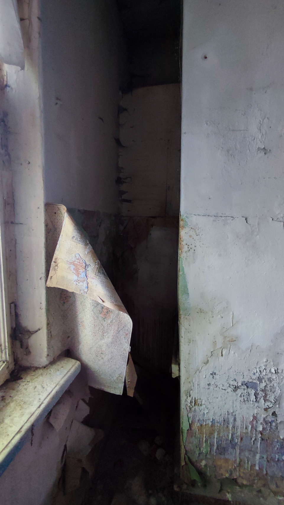 На изображении виден угол старого помещения, где обои сильно отслоились от стены, обнажив поврежденную штукатурку и следы воздействия влаги. Земля и обломки на полу указывают на длительное отсутствие ухода. Справа виден фрагмент окна и подоконник, частично покрытый пылью и остатками старой отделки. Стены имеют неоднородную окраску, трещины и следы разрушений. Кадр подходит для материалов о состоянии аварийных помещений, визуализации процессов разрушения и анализа старых зданий.