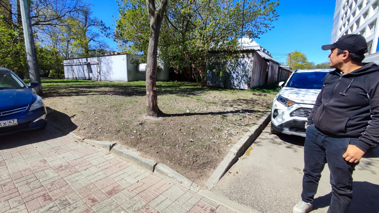 На фотографии изображён участок парковочной зоны, где в центре расположен ствол дерева с механическими повреждениями. По обе стороны от него стоят легковые автомобили, справа виден человек в тёмной одежде. На заднем плане расположены хозяйственные постройки и контейнеры технического назначения. Съёмка выполнена днём при солнечной погоде. Фотография может использоваться в материалах о придомовой инфраструктуре, парковке, состоянии зелёных насаждений и городской среде.