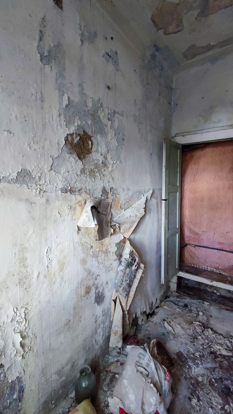 На фото представлена часть комнаты со стеной, покрытой крупными участками отслоившейся штукатурки и следами влаги. На полу лежат строительные мешки, обломки материалов и бытовые остатки. Справа заметен проём, ведущий в другое помещение, рядом — открытая дверь. Стена имеет трещины, неоднородную окраску и значительные признаки износа. В верхней части виднеется вентиляционная решетка. Фото можно использовать для материалов о разрушении интерьеров, обследовании аварийных зданий и визуализации старых помещений.