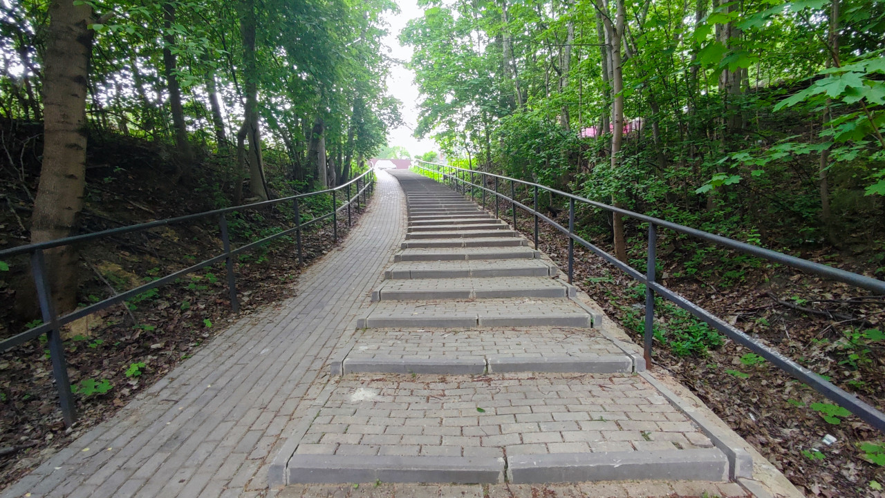 На снимке изображена длинная пешеходная лестница, выложенная брусчаткой и оснащённая металлическими поручнями по обеим сторонам. Лестница проходит через тенистую лесопарковую территорию с густой листвой и деревьями по обочинам. Участок выполнен с чередованием ступеней и пологих наклонных сегментов для удобного подъёма. В верхней части виден яркий участок, освещённый дневным светом. Фотография может применяться в материалах о благоустройстве, городских пешеходных маршрутах, туристических тропах, инфраструктуре парков и экологичных городских пространствах.