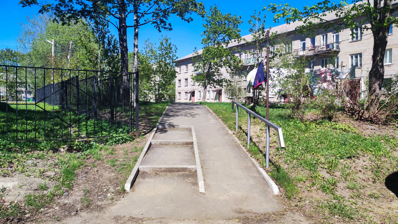 Пешеходная дорожка с перилами у жилого дома