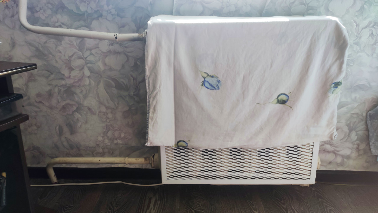 Радиатор отопления, закрытый тканью в жилой комнате