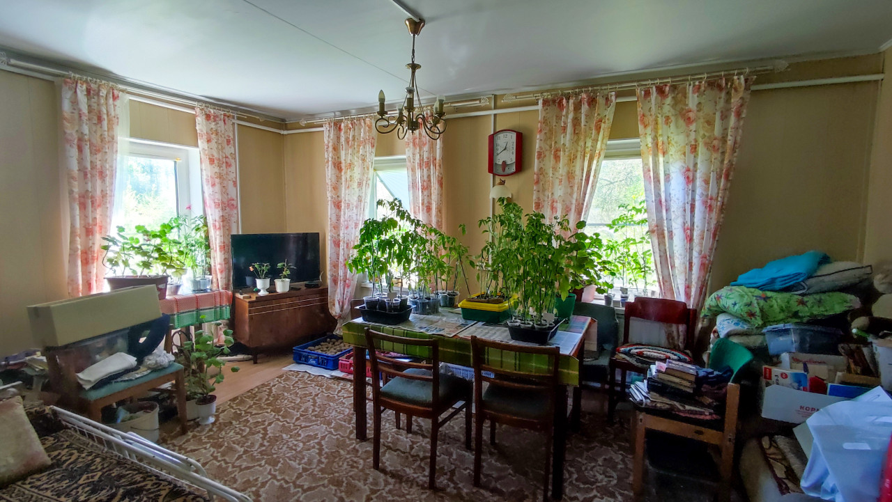На изображении представлена жилая комната, в которой на большом столе размещены многочисленные горшки с растениями и рассадой. В помещении видны несколько окон с цветочными шторами, телевизор на тумбе, стулья, коробки и предметы хранения, а также мягкая мебель. По периметру стен проложены трубы отопления. Обстановка указывает на использование комнаты как жилого и хозяйственного пространства. Фотография может применяться в материалах о быте, выращивании растений в помещении, организации пространства и жизни в частных домах или старых квартирах.