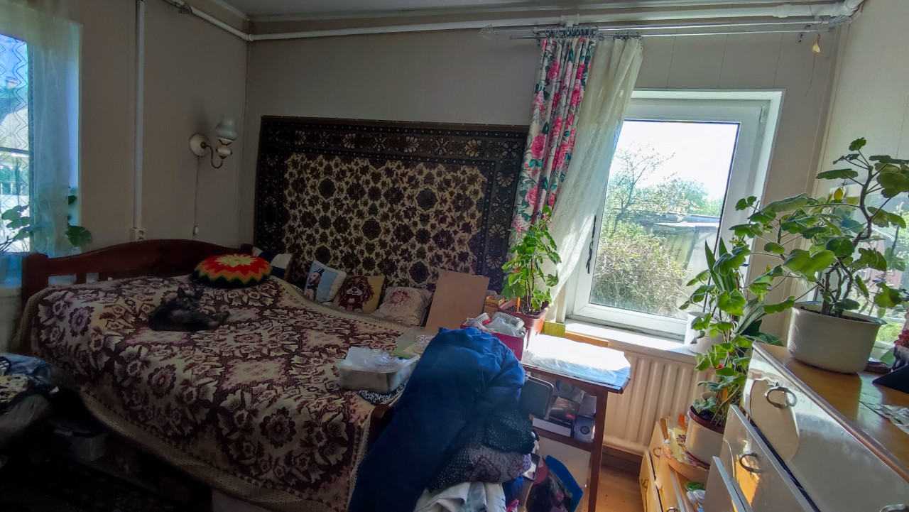 На фотографии изображена спальня с деревянной кроватью, покрытой пледом с узорчатым рисунком, на которой лежит кошка. За изголовьем висит настенный ковер с геометрическим орнаментом. У окна расположены комнатные растения в горшках, подоконник освещён дневным светом. Справа стоит комод с предметами быта, впереди небольшой стол с вещами. На стенах заметна электропроводка открытого типа, а над кроватью установлено бра. Снимок подходит для материалов о быте, организации пространства, интерьерах старых домов и повседневной домашней обстановке.