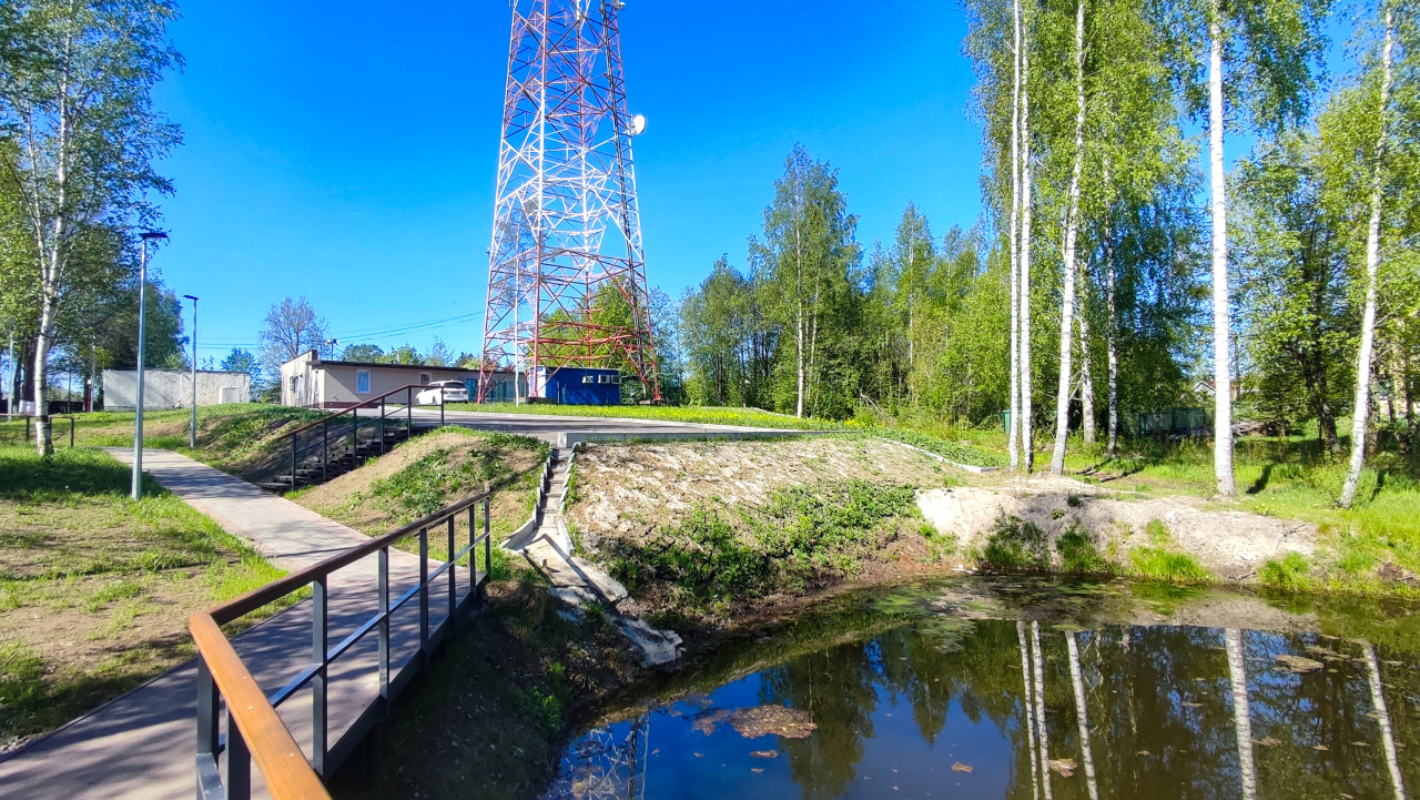 На снимке показан благоустроенный участок вокруг небольшого водоёма, в котором отражаются деревья и элементы инфраструктуры. Слева виднеется пешеходная дорожка с перилами и лестницей, ведущей к верхнему уровню площадки. На высоте расположен участок с асфальтовой дорогой, зданием технического назначения и парковочным местом. Над территорией возвышается металлическая телекоммуникационная башня решётчатой конструкции с антеннами. Справа видна лесополоса с берёзами. Сцена снята при ясной погоде, что подчёркивает сочетание природной и технической среды. Подходит для материалов о благоустройстве, инженерной инфраструктуре и городской экологии.