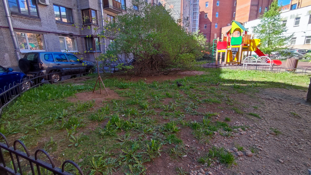 Двор с густым кустарником и детской площадкой на фоне жилых зданий