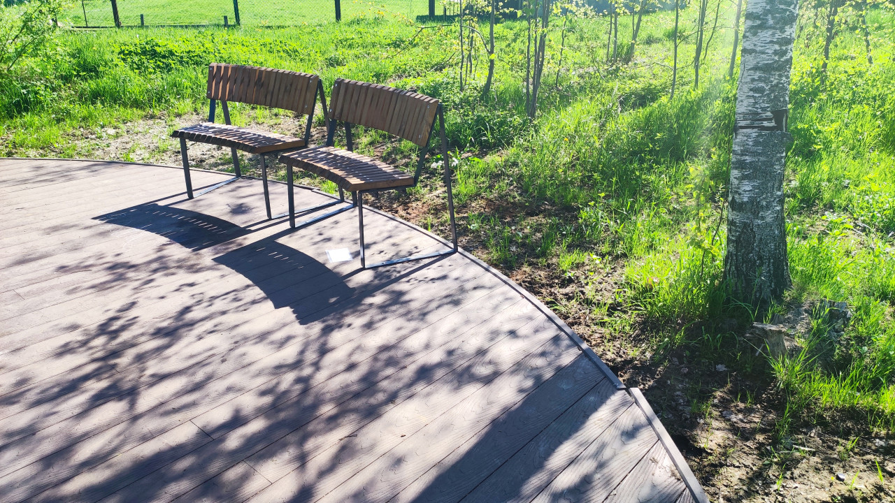 На изображении показана круглая деревянная площадка с установленными на ней двумя лавочками на металлическом каркасе. Лавочки расположены в зоне рассеянной тени от деревьев, окружающих площадку. На заднем плане заметна зелёная территория с молодой травой и невысокими кустарниками. Освещение подчёркивает структуру настила и тени от крон деревьев. Снимок передаёт состояние благоустроенной зоны отдыха в летний период и подходит для материалов о городских общественных пространствах, ландшафтном дизайне и оформлении рекреационных зон.