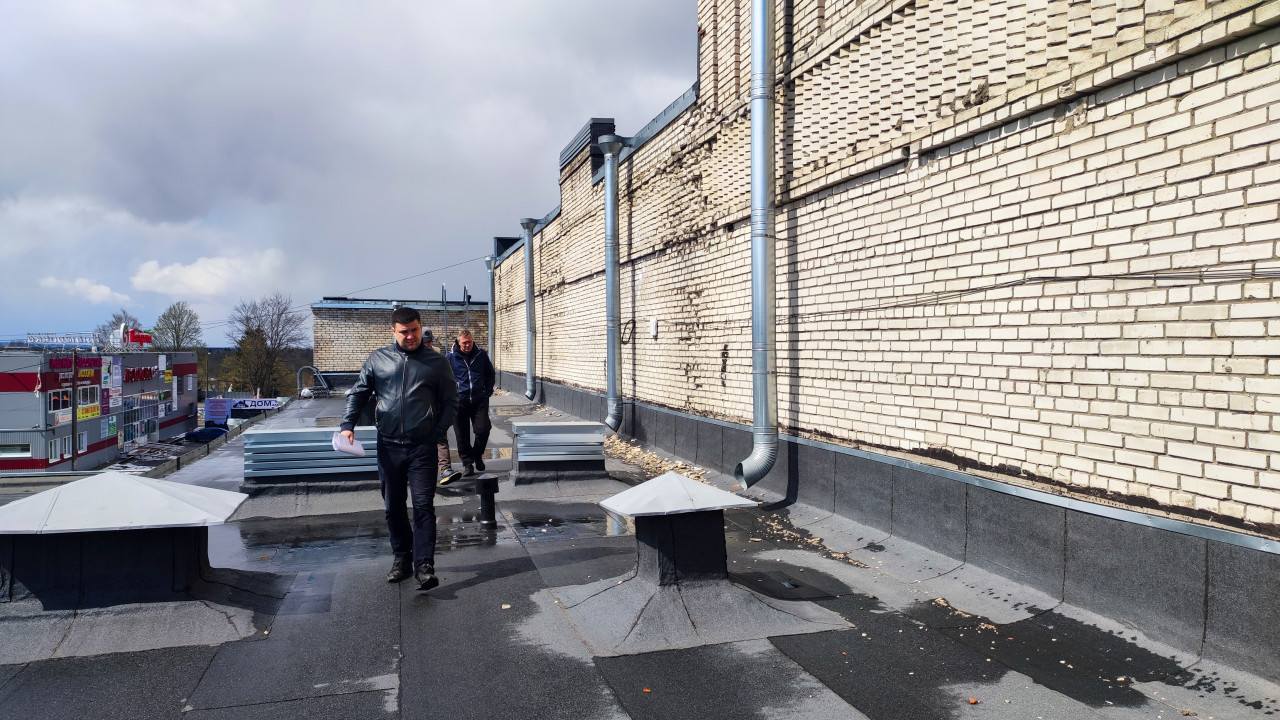 На фотографии запечатлена плоская кровля кирпичного здания, по которой идут двое мужчин, держащих документы. Видна длинная фасадная стена из светлого кирпича с металлическими водосточными трубами, вентиляционными выходами и элементами инженерных коммуникаций. На поверхности кровли лежат остатки влаги после осадков, заметны металлические шахты, вентиляционные колпаки и бортики покрытия. На заднем плане частично виден соседний торговый комплекс и деревья. Сцена подходит для материалов о техническом состоянии зданий, эксплуатации и обследовании кровель.