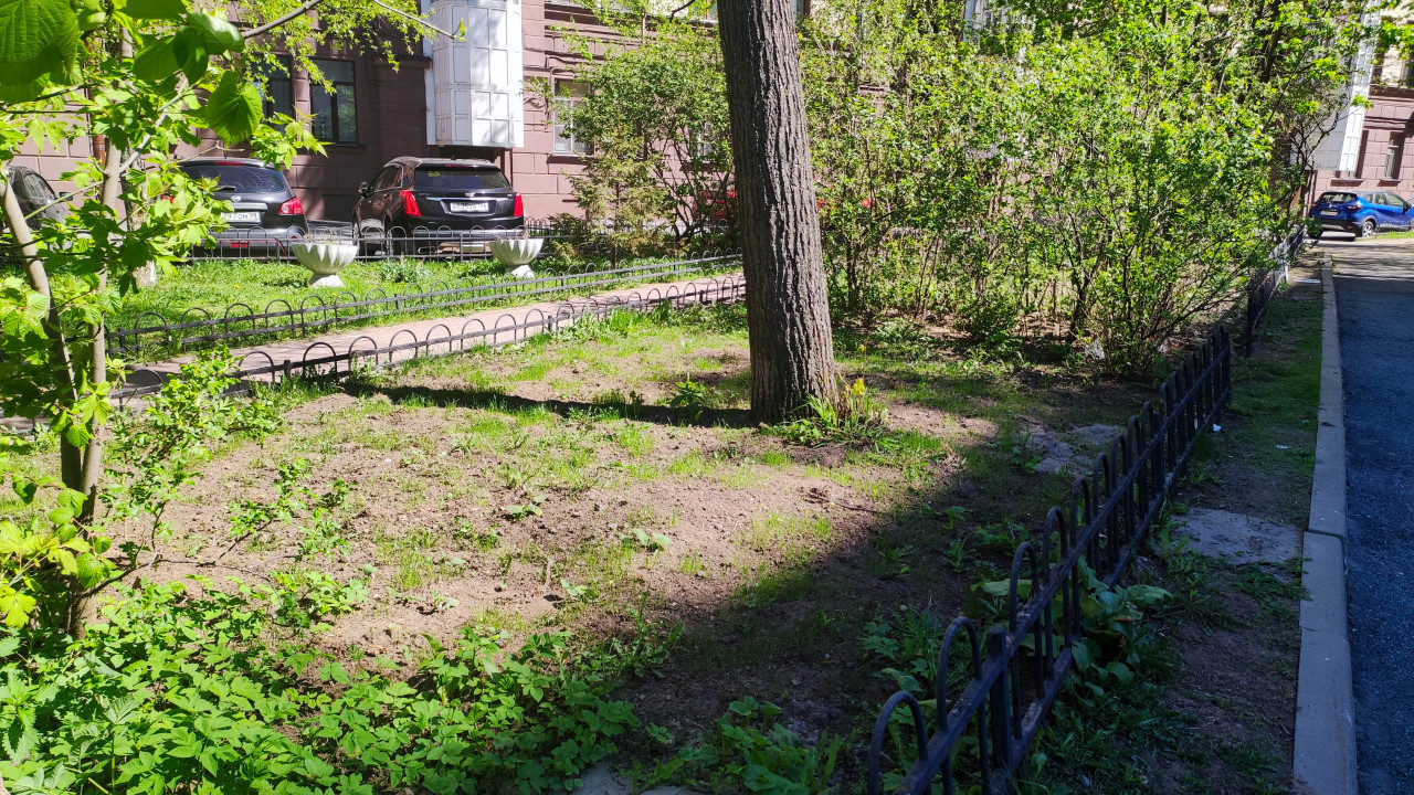Озеленённая придомовая территория с деревом и кустарниками возле жилого дома