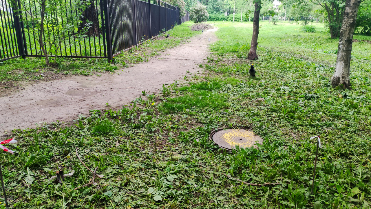 Грунтовая тропа вдоль забора и люк инженерных сетей на зелёной территории