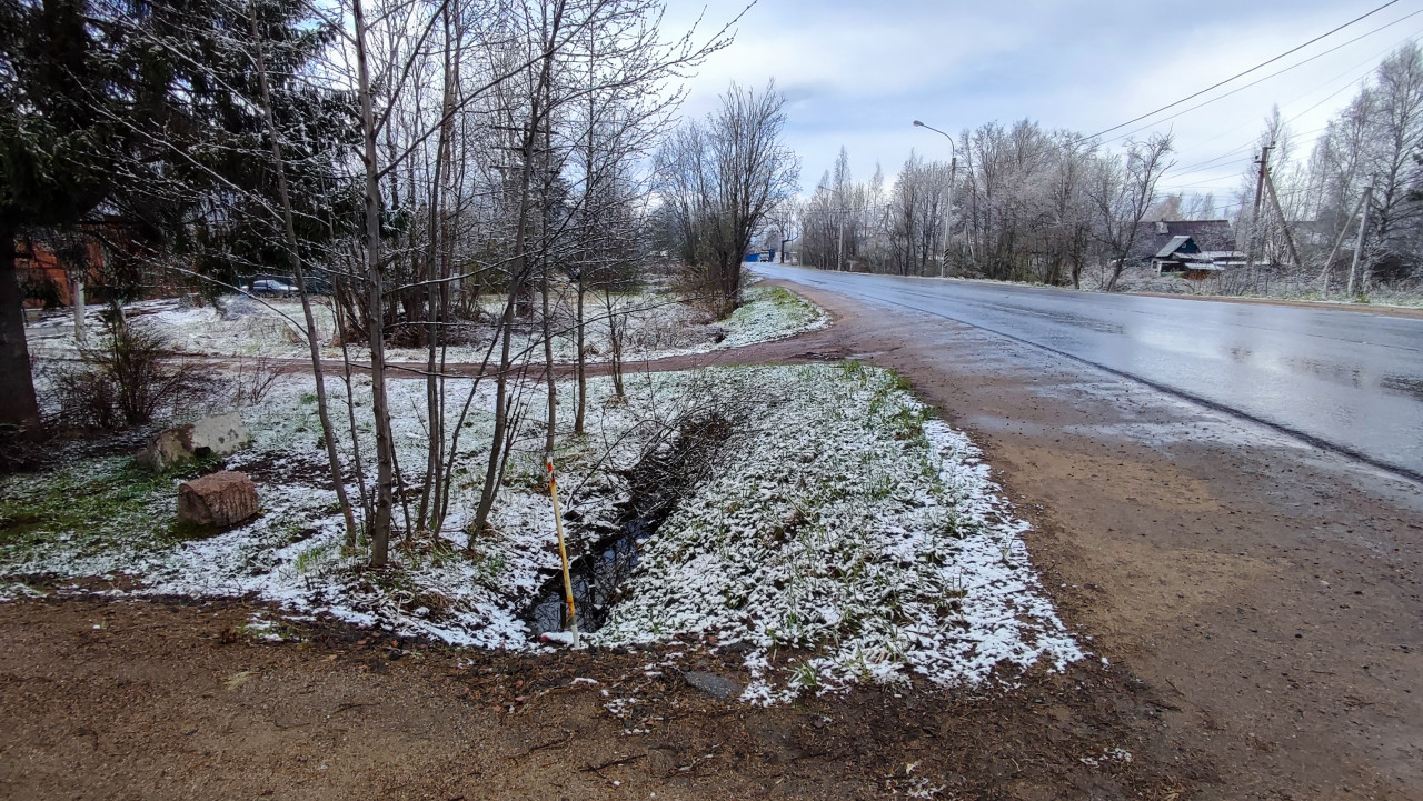 На фотографии изображена загородная дорога с влажным асфальтом, расположенная рядом с участками, заросшими кустарником и деревьями. На земле виден неравномерный слой снега, оставшийся после недавнего снегопада. На переднем плане заметна канава с небольшим количеством талой воды. В кадре присутствуют линии электропередач, уличное освещение и просматривающиеся вдалеке постройки. Фото может быть использовано в материалах о дорожных условиях, загородной инфраструктуре и сезонных природных явлениях.