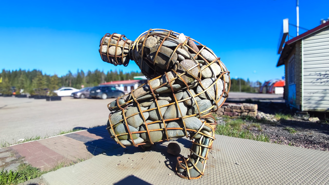 скульптура каменная фигура камни арт объект декоративный объект металлический каркас уличное искусство ландшафтный дизайн уличная зона придорожная территория оформление территории композиция из камней декоративные элементы парковка автомобили плитка зелёная зона декоративная композиция уличная среда объект на улице загородная инфраструктура деревянные постройки природная зона круглые камни дневная съёмка наружная площадка придорожный сервис архитектурная средаПохожие фотографии