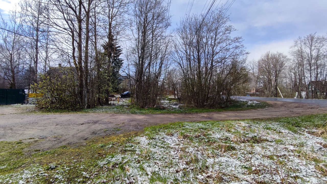 На снимке показан грунтовый подъезд, ведущий к асфальтовой дороге. Земля и трава частично покрыты тонким снежным слоем. В центре находится группа деревьев и кустарников, за которыми виден небольшой дом с невысокой крышей. На заднем плане различима дорога, несколько участков с редкой частной застройкой и автомобиль, частично скрытый растительностью. В кадре также заметны воздушные линии электропередачи. Изображение можно использовать в материалах о поселковых территориях, дорожных подъездах и сезонных изменениях природы.