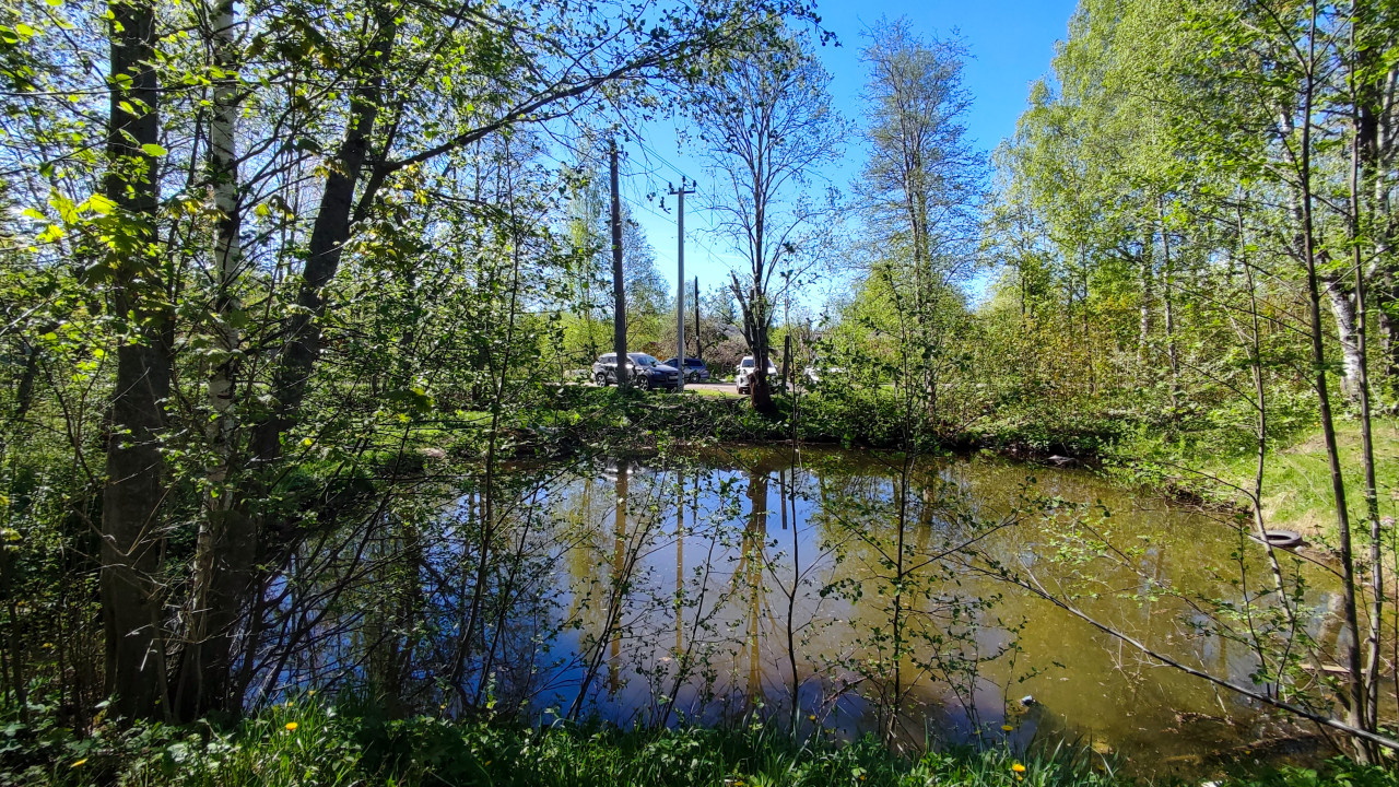 На снимке представлен небольшой пруд, окруженный лиственными деревьями и густыми кустарниками, расположенный рядом с просматриваемой автодорогой. На противоположном берегу видны припаркованные автомобили и опоры линий электропередачи. Вода отражает небо и стволы деревьев, а берега частично заросли травой и весенней зеленью. Фотография подходит для использования в материалах о природных зонах вблизи городской среды, сезонных прогулках, локальных водоёмах, экологических наблюдениях и ландшафтных особенностях населённых пунктов.