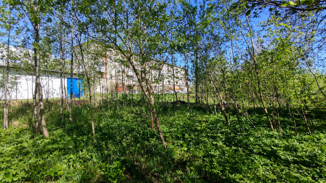 На фотографии виден участок густой растительности, включающий молодые деревья, травяной покров и кустарники, расположенный перед многоэтажным жилым зданием, просматривающимся через стволы в глубине кадра. На переднем плане расположен плотный слой зелёной травы, а тонкие стволы лиственных деревьев формируют визуальную сетку. Снимок подходит для материалов о городской среде, зелёных массивах вблизи жилых кварталов, экологических наблюдениях, сезонной динамике растительности и теме локальных природных зон.