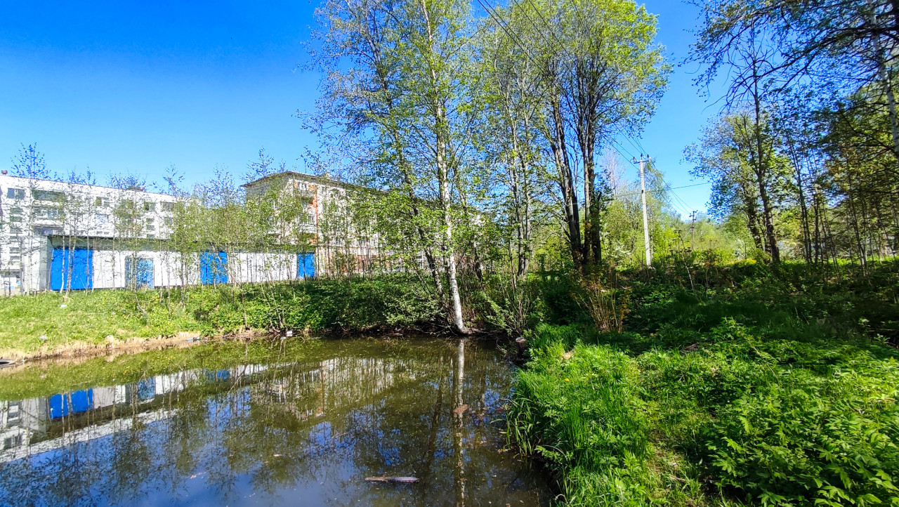 На фото представлен небольшой пруд с мутной водой, расположенный рядом с густой зелёной растительностью и деревьями. На заднем плане видны стены жилого здания и одноэтажных помещений с синими дверями, отражающиеся частично в воде. По краям пруда растут кустарники, трава и молодые деревья. Фотография подходит для материалов о городской экологии, локальных водоёмах, состоянии растительности у жилых территорий и сезонных наблюдениях за малыми природными объектами.