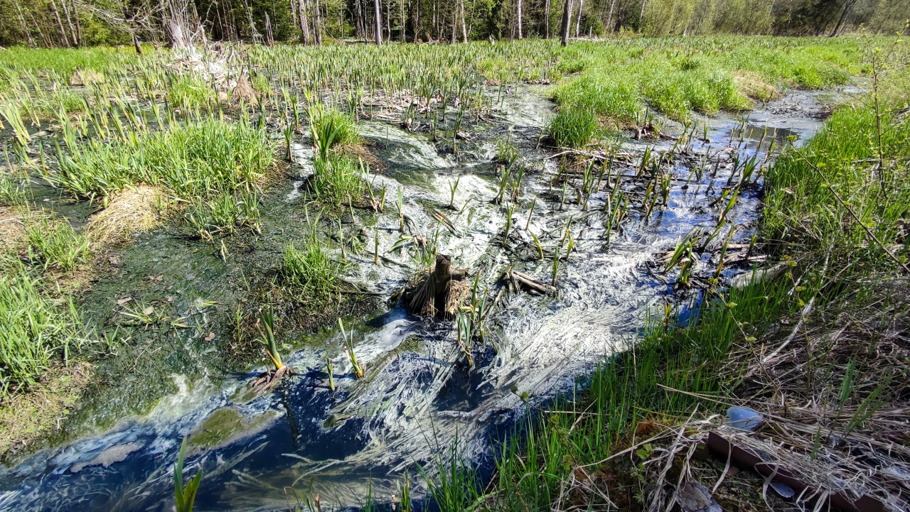 Фотография демонстрирует участок заболоченного потока, где молодые побеги болотных растений поднимаются через слой водорослей и органических отложений. На поверхности воды заметны светлые волокнистые разводы, создаваемые биомассой. Между участками воды располагаются плотные зелёные островки дернины. На заднем плане виден смешанный лес, состоящий из берёзовых и хвойных деревьев. Освещение подчёркивает контраст между тёмной водой и яркой молодой зеленью. Снимок подходит для публикаций об экологии влажных территорий, сезонных изменениях и природных биотопах.