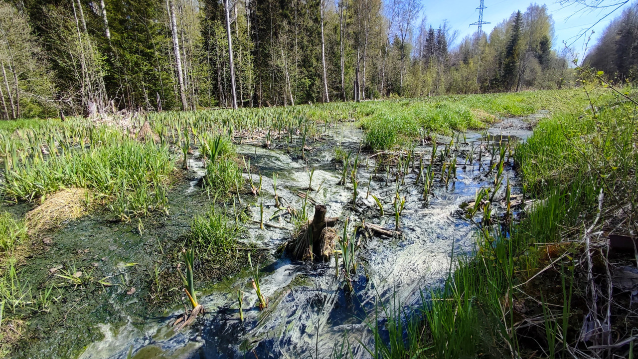 На изображении запечатлён небольшой заболоченный поток, протекающий по низине среди смешанного леса. На поверхности воды заметны белые и зелёные водорослевые разводы, формирующие характерный узор. Вдоль русла расположены густые участки молодой болотной растительности, а также остатки прошлогодних стеблей и древесных фрагментов. Вдали просматриваются деревья хвойных и лиственных пород, а также линия электропередачи, проходящая над лесом. Снимок подходит для материалов, посвящённых природным болотным системам, сезонным изменениям и изучению водных биотопов.