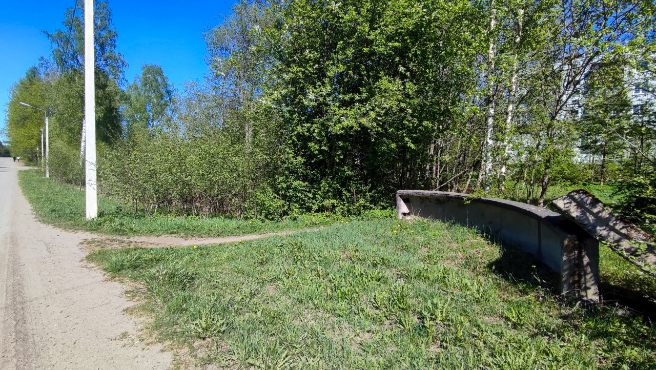 На фото изображена узкая пешеходная тропа, ведущая вдоль дороги, рядом с густой зелёной растительностью. Слева находится ряд опор уличного освещения, а справа — крупный бетонный элемент, лежащий на траве. За тропой виднеется молодой весенний кустарник и деревья, характерные для северо-запада России. Снимок может быть использован в материалах о благоустройстве, состоянии придорожных зон, пешеходной инфраструктуре и природных объектах в городской черте.