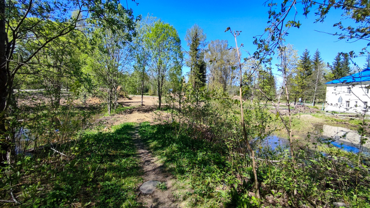 На фотографии изображена тропинка, проходящая вдоль небольшого пруда, окружённого молодой зелёной растительностью. По правую сторону заметен участок земли, на котором недавно проводилась вырубка деревьев, что видно по пням и очищенной территории. На заднем плане расположено здание с яркой синей крышей. Слева деревья отражаются в воде, придавая сцене характер природной зоны на окраине населённого пункта. Снимок подходит для материалов об экологии, благоустройстве зелёных территорий, водоёмах и городской природе.