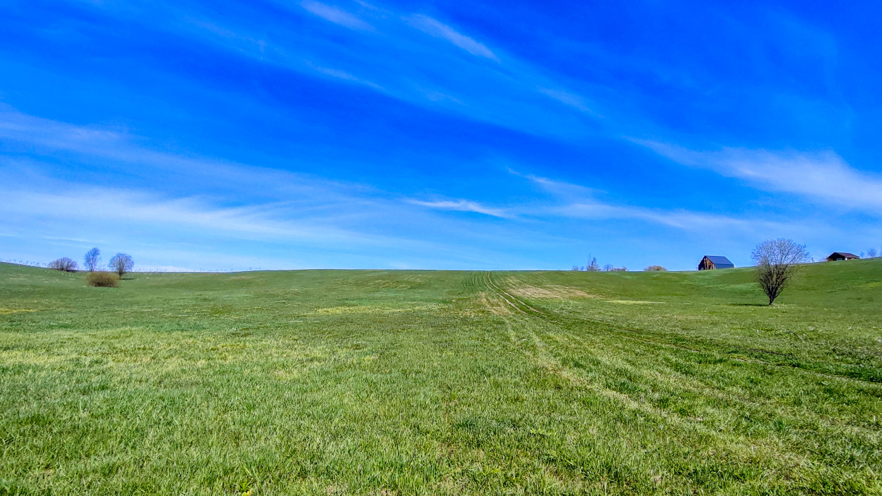 На снимке показано широкое зелёное пространство с плавными подъёмами рельефа, переходящими в невысокий холм. На горизонте расположены отдельные деревья и два строения, предположительно жилые или хозяйственные. Трава равномерно покрывает землю, а линии от техники или транспорта образуют направленную дорожку к верхней точке холма. Небо заполнено мягкими полосами облаков, что создаёт равномерное освещение. Фото подходит для тем сельской жизни, природных ландшафтов, землепользования и визуальных проектов о пространстве и перспективе.