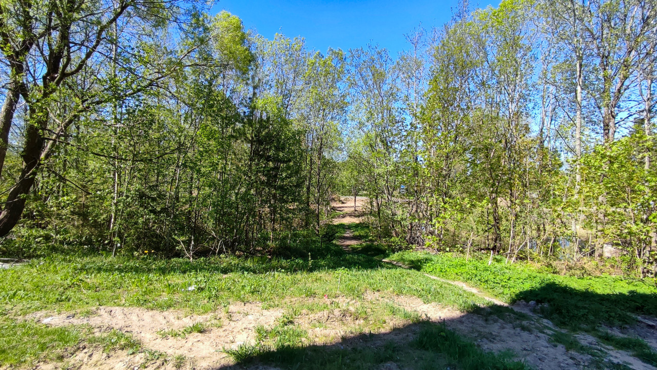 На снимке показана узкая тропа, ведущая через участок молодой лесной растительности. Дорога утопает среди кустов и молодых деревьев, а на горизонте виден открытый участок земли. Светлая тень от деревьев указывает на дневную съёмку в ясную погоду. На переднем плане видны следы естественного рельефа и небольшие участки травы. Изображение подходит для материалов о природе, экотропах, прогулочных маршрутах и благоустройстве территорий, расположенных вблизи населённых пунктов.