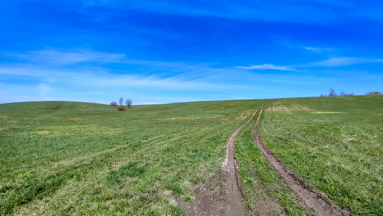На снимке представлено широкое поле с молодой травой, по которому проходит пара глубоких дорожных колей, уходящих к вершине небольшого холма. На горизонте видны несколько деревьев и небольшие участки кустарников. Справа заметен плавный подъём местности. Небо покрыто тонкими облачными полосами, создающими мягкую текстуру. Вид указывает на раннюю весну, когда растительность только начинает активно расти. Фотография подходит для использования в материалах о природе, сельских территориях, ландшафтах и экологических темах.