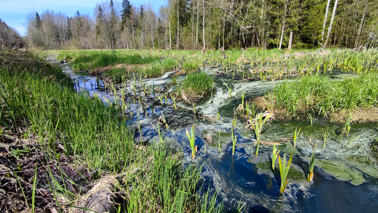 На фотографии показан участок природного стока, проходящий через заболоченную зону с плотной растительностью. В кадре заметны молодые побеги тростника, растущие прямо из мелководной воды, а также участки водорослей и растительных остатков, движущихся по течению. Лесной массив на горизонте состоит из смешанных деревьев, среди которых преобладают хвойные и лиственные породы. Яркое освещение и насыщенный цвет листвы указывают на весенний период. Эта фотография подходит для экологических исследований, материалов о болотных экосистемах, водных ресурсах и естественной динамике стока в природных условиях.