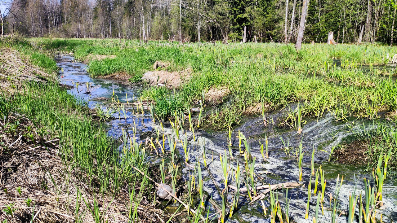 На снимке виден извилистый низинный ручей, текущий через участок заболоченной равнины. В воде заметны молодые побеги водных растений, в том числе осоки и тростника, формирующие плотные группы вдоль русла. На заднем плане расположен смешанный лес с преобладанием лиственных деревьев, у которых уже распустились свежие листья. Освещение указывает на солнечный весенний день. Территория не содержит искусственных сооружений, и снимок может быть использован в публикациях о природных водоемах, биотопах влажных зон, сезонном развитии растительности и исследовании местных экосистем.