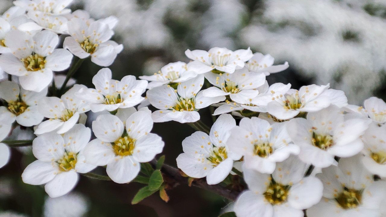 Цветущая ветвь спиреи в макросъёмке